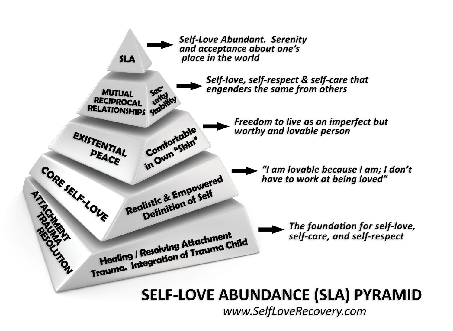 There is however a cure for Self-Love Deficit Disorder (or codependency): the achievement of self-love abundance. This is the exact opposite of each of the SLDD pyramid’s levels.